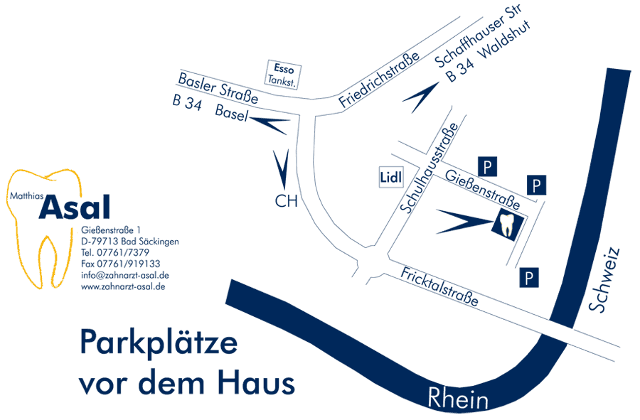 KontaktZahnarzt Matthias AsalGießenstraße 1 D-79713 Bad Säckingen Tel.: +49 (0) 7761-73 79 info@zahnarzt-asal.de ![]()